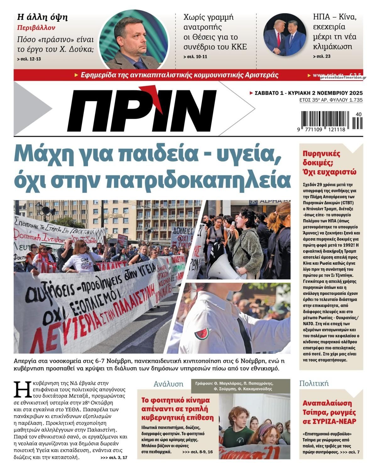 Διαβάστε το πρωτοσέλιδο της εφημερίδας Πριν για την 01-11-2025