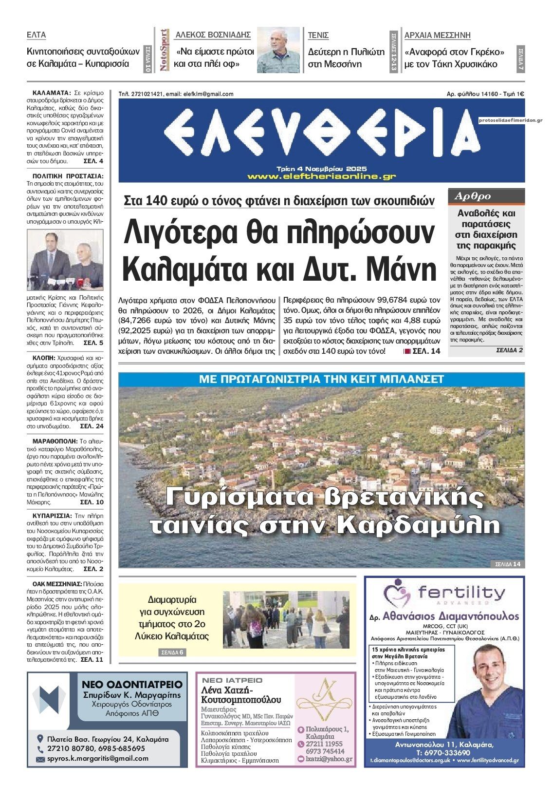 Διαβάστε το πρωτοσέλιδο της εφημερίδας Ελευθερία Καλ. για την 04-11-2025
