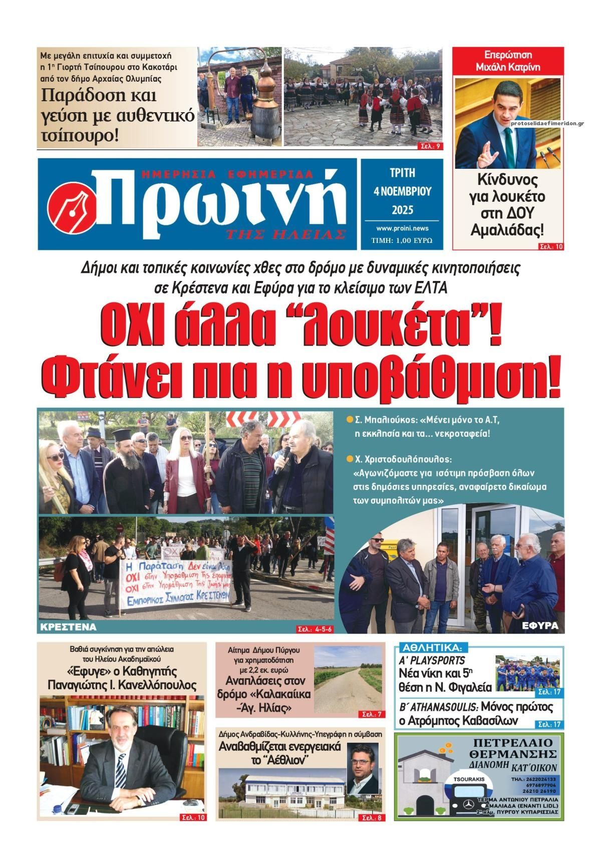 Διαβάστε το πρωτοσέλιδο της εφημερίδας Πρώινή Ηλείας για την 04-11-2025