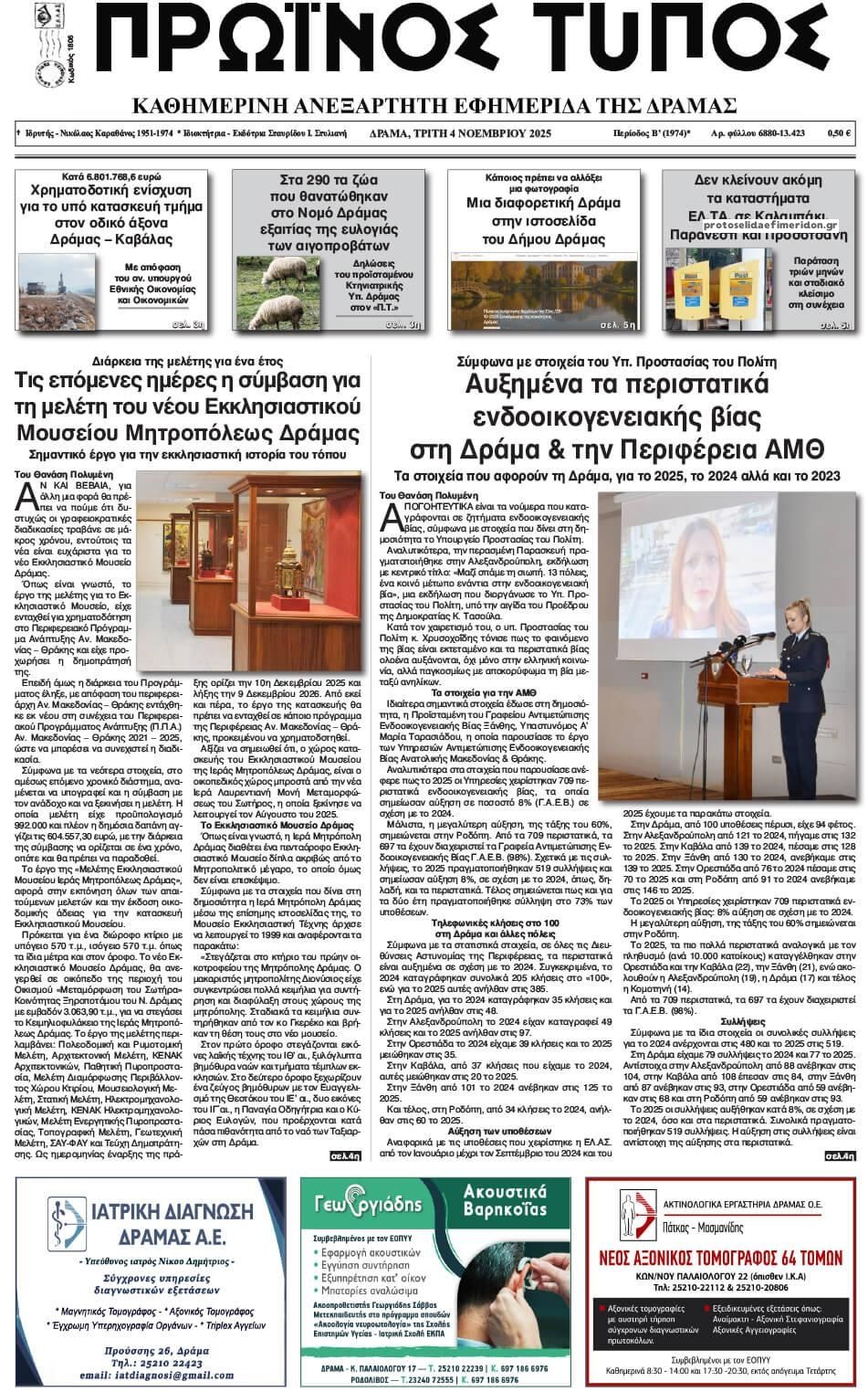 Διαβάστε το πρωτοσέλιδο της εφημερίδας Πρωινός Τύπος Δρ. για την 04-11-2025