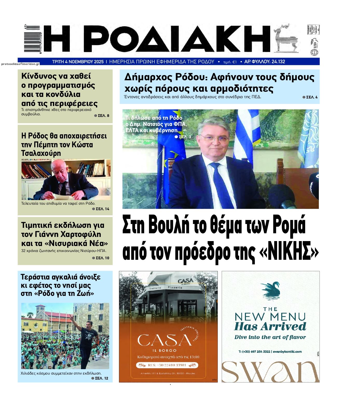 Διαβάστε το πρωτοσέλιδο της εφημερίδας Ροδιακή για την 04-11-2025