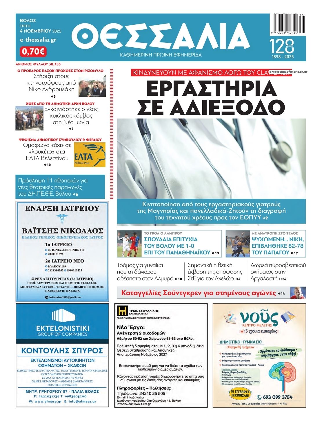 Διαβάστε το πρωτοσέλιδο της εφημερίδας Θεσσαλία για την 04-11-2025