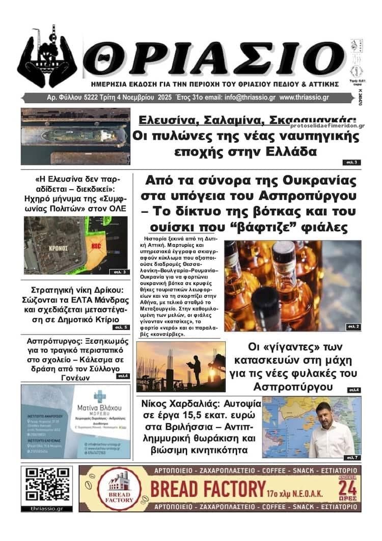 Διαβάστε το πρωτοσέλιδο της εφημερίδας Θριάσιο για την 04-11-2025