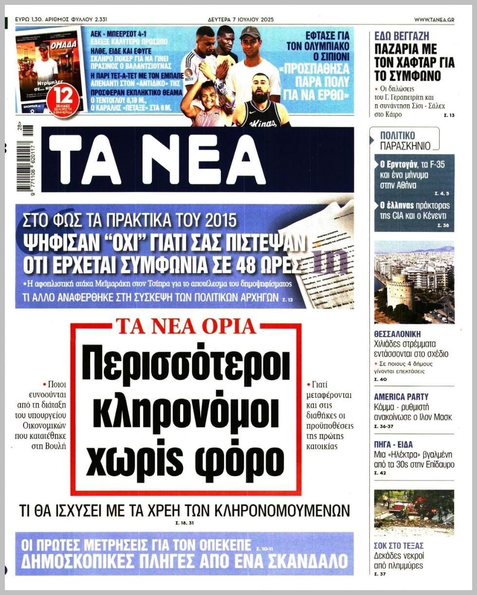 Διαβάστε το πρωτοσέλιδο της εφημερίδας Τα Νέα για την 07-07-2025