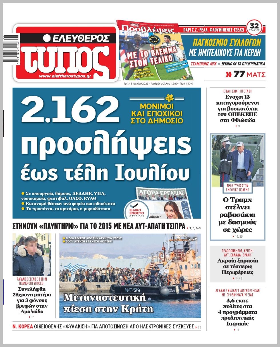 Διαβάστε το πρωτοσέλιδο της εφημερίδας Ελεύθερος Τύπος για την 08-07-2025
