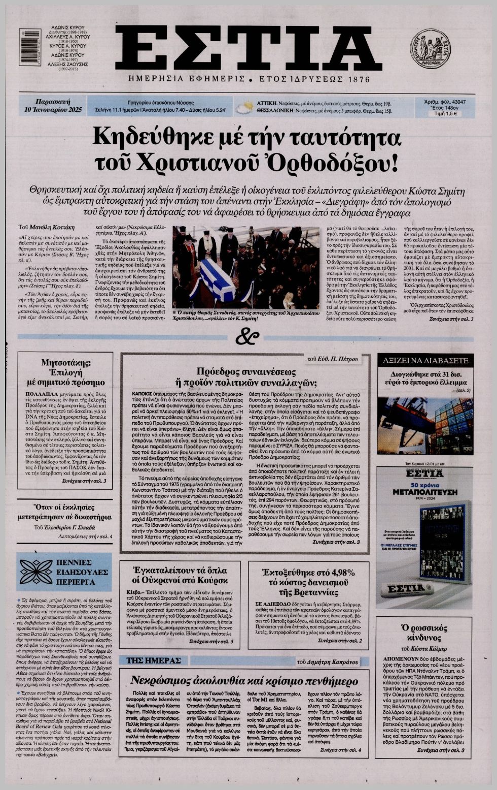 Διαβάστε το πρωτοσέλιδο της εφημερίδας Εστία για την 10-01-2025