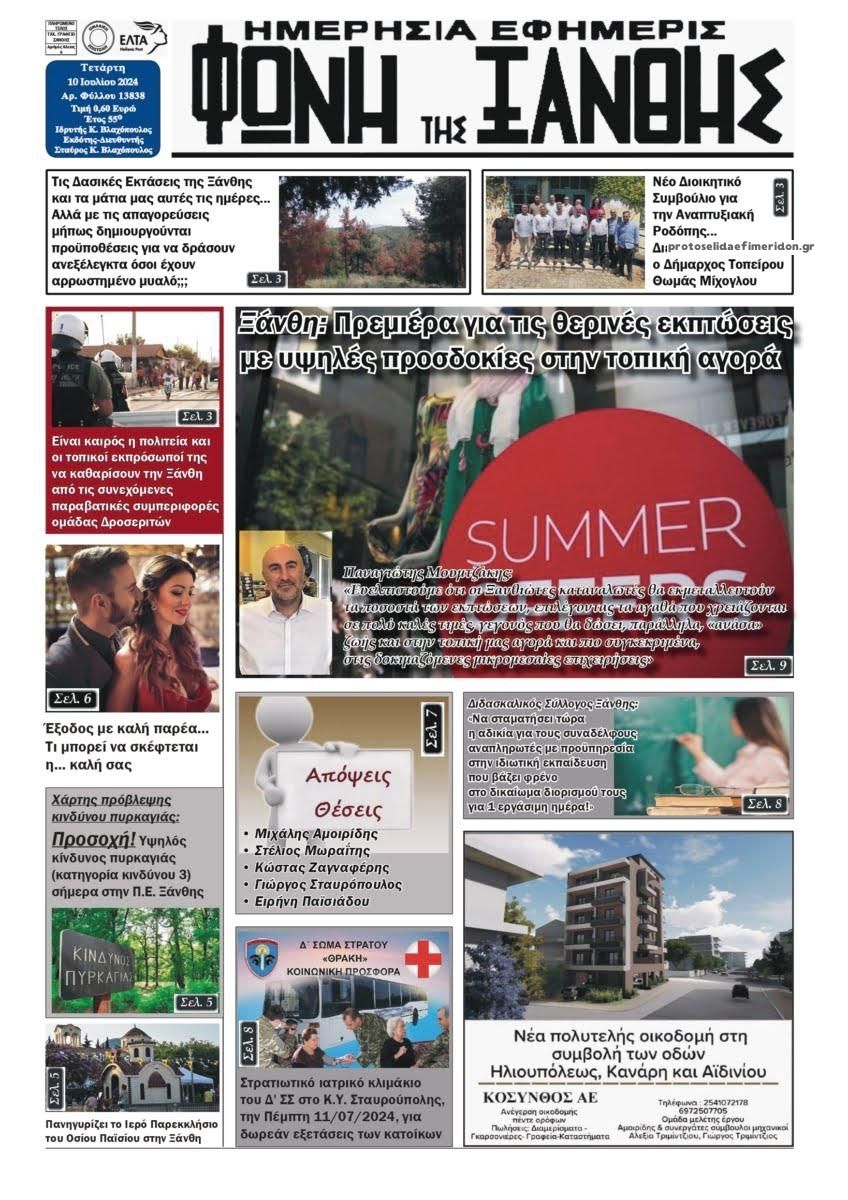 Διαβάστε το πρωτοσέλιδο της εφημερίδας Φωνή της Ξάνθης για την 10-07-2024