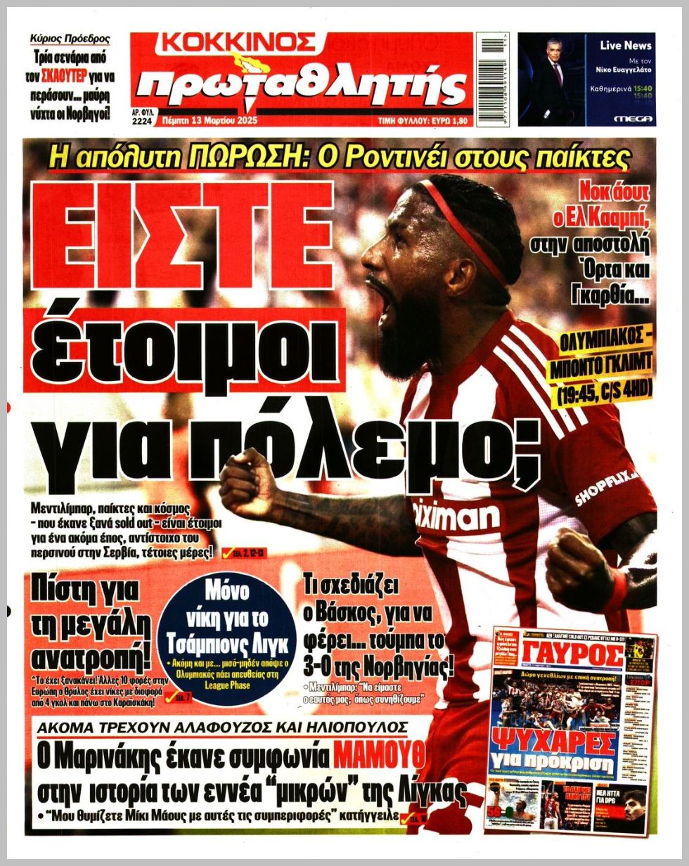Διαβάστε το πρωτοσέλιδο της εφημερίδας Πρωταθλητής για την 13-03-2025