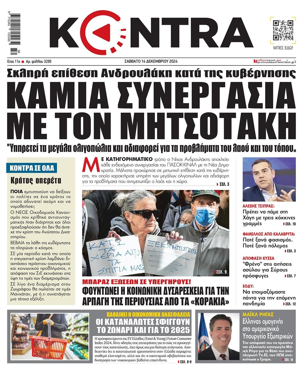Διαβάστε το πρωτοσέλιδο της εφημερίδας Kontra News για την 14-12-2024