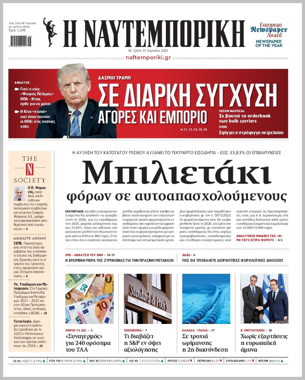 Διαβάστε το πρωτοσέλιδο της εφημερίδας Ναυτεμπορική για την 15-04-2025