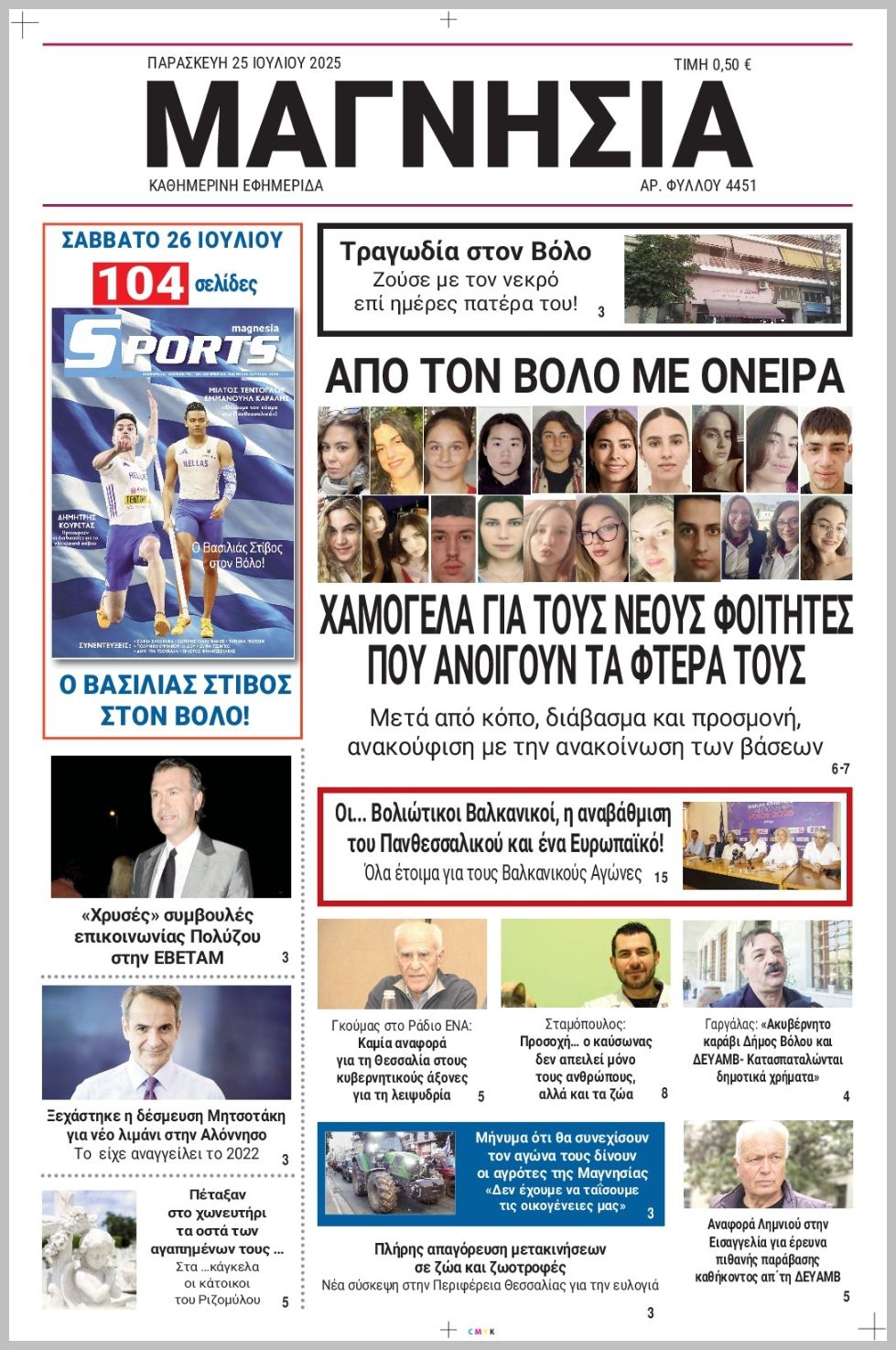 Διαβάστε το πρωτοσέλιδο της εφημερίδας Μαγνησία για την 25-07-2025