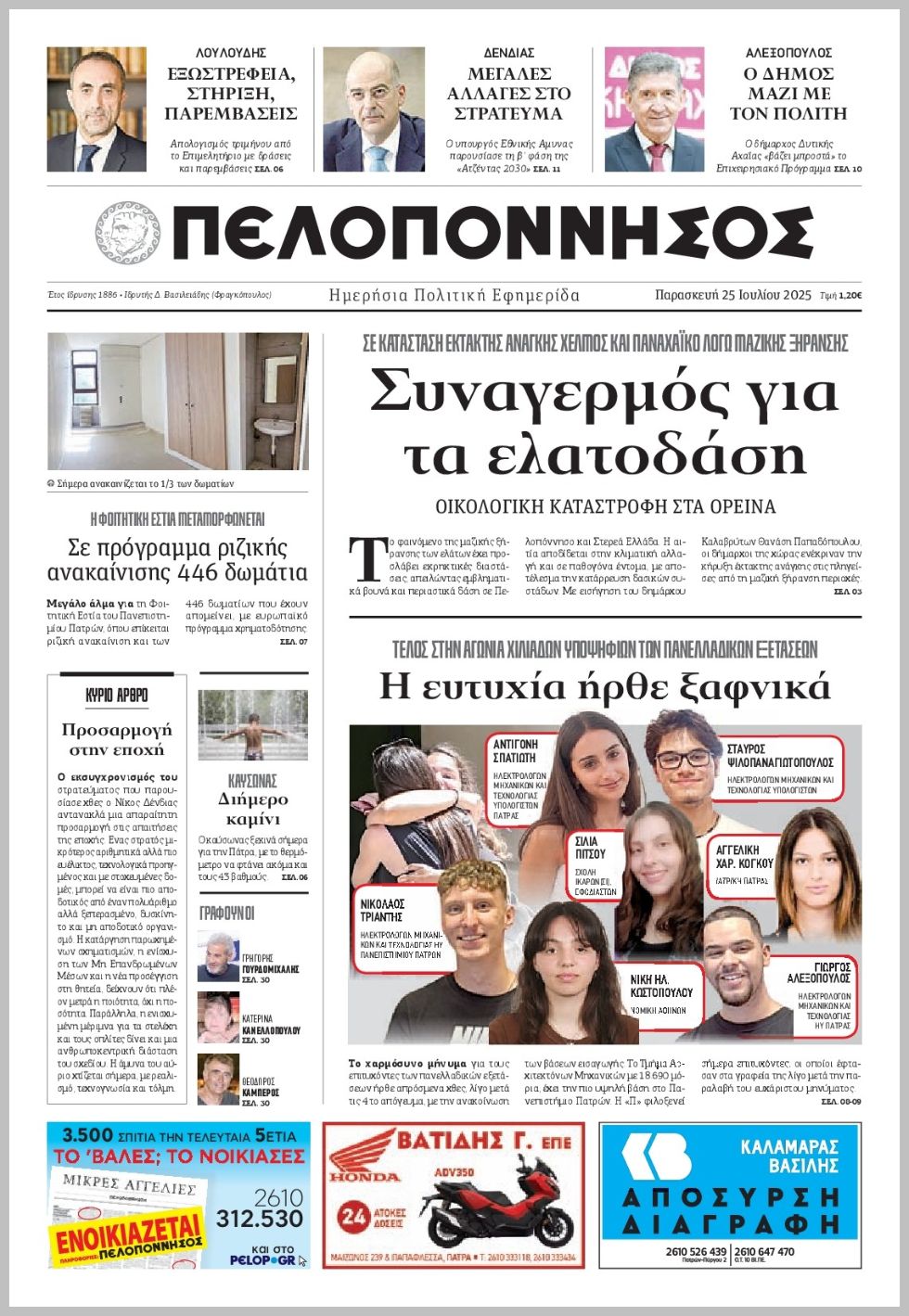Διαβάστε το πρωτοσέλιδο της εφημερίδας Πελοπόννησος για την 25-07-2025