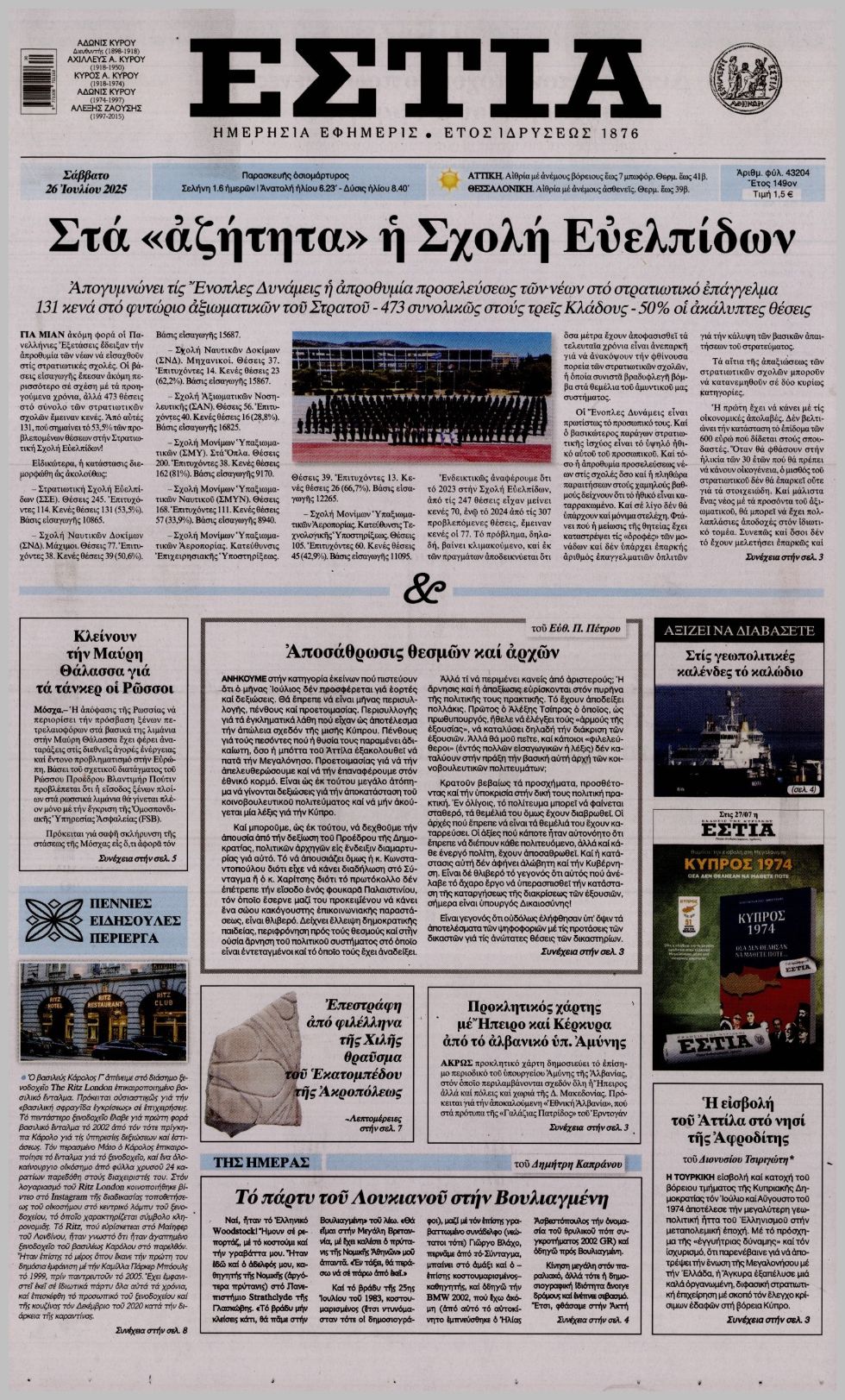 Διαβάστε το πρωτοσέλιδο της εφημερίδας Εστία για την 26-07-2025