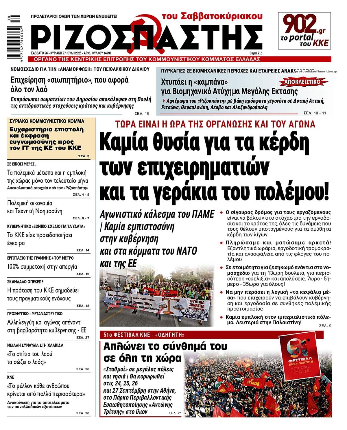 Διαβάστε το πρωτοσέλιδο της εφημερίδας Ριζοσπάστης για την 26-07-2025
